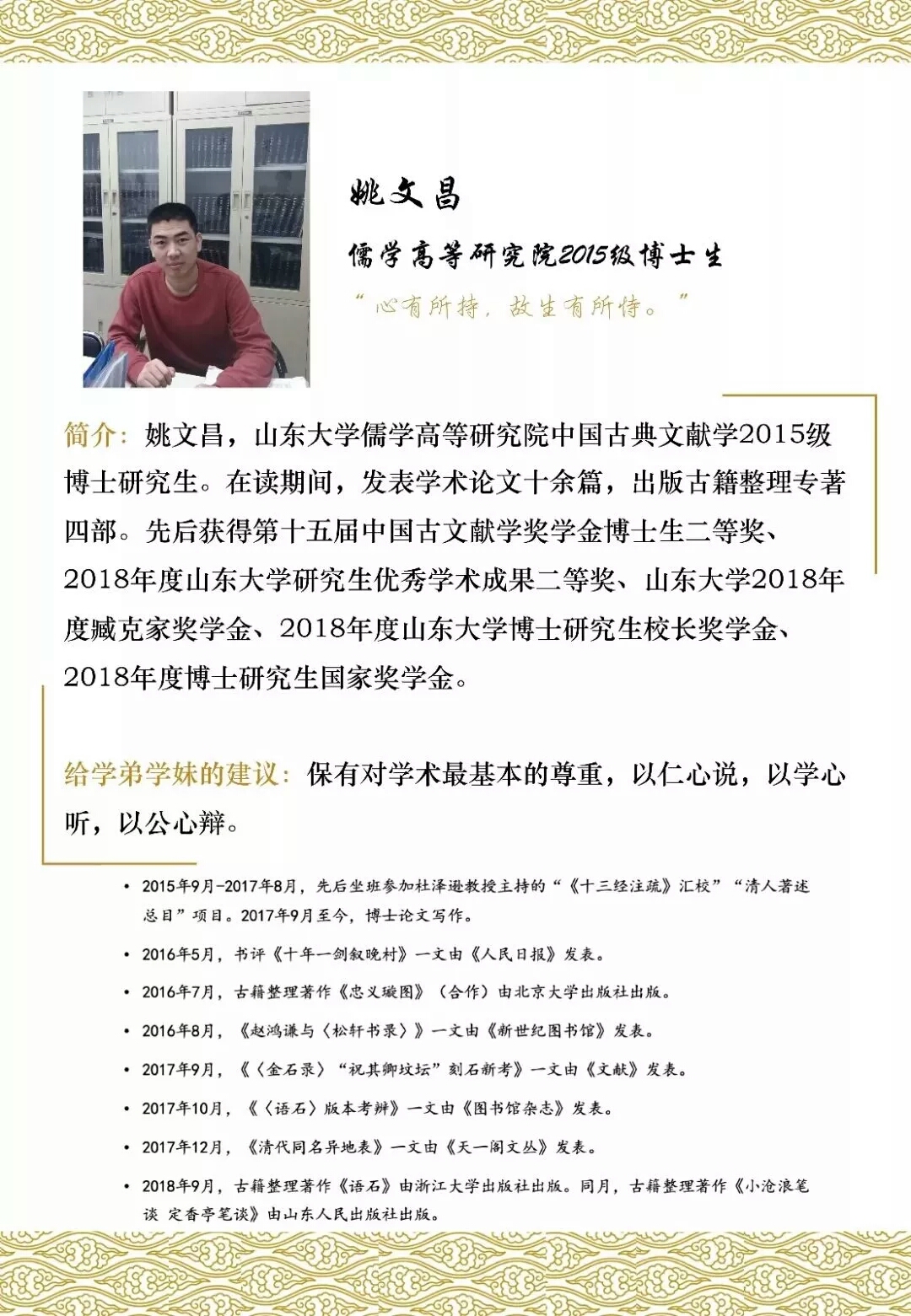 2018年度研究生优秀学术成果二等奖、2018年度臧克家奖学金、2018年度博士生国家奖学金、2018年度研究生校长奖学金。回顾学术道路,2015年9月至2017年8月,参加导师杜泽逊教授的“清人著述总目”“《五经正义》汇校与研究”项目。2017年9月至今,进行博士论文写作。2016年5月,书评《十年一剑叙晚村》一文由《人民日报》发表。2016年7月,古籍整理著作《忠义璇图》(合作)由北京大学出版社出版。2016年8月,《赵鸿谦与〈松轩书录〉》一文由《新世纪图书馆》发表。2017年9月,《〈金石录〉“祝其卿坟坛”刻石新考》一文由《文献》发表。2017年10月,《〈语石〉版本考辨》一文由《图书馆杂志》发表。2017年12月,《清代同名异地表》一文由《天一阁文丛》发表。2018年9月,古籍整理著作《语石》由浙江大学出版社出版。同月,古籍整理著作《小沧浪笔谈 定香亭笔谈》由山东人民出版社出版。