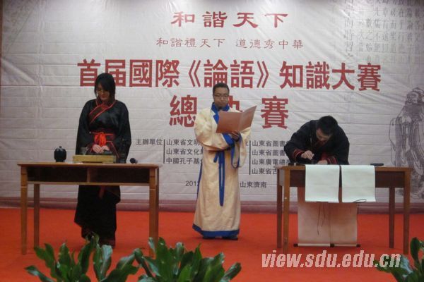 首届国际《论语》知识大赛由山东省文明办、省文化厅、中国孔子基金会联合主办,山东省图书馆学会、山东省图书馆、山东广电总台国际频道等单位承办,旨在推动《论语》及儒家思想传播,弘扬中华传统文化。大赛吸引了海内外500余名选手参加,其中既有古稀老人,也有少年儿童,还有来自蒙古、喀麦隆、老挝等国的留学生。