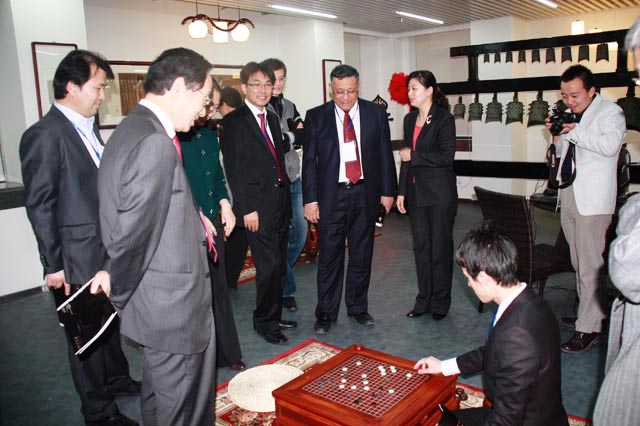 感受中国传统文化元素:瓷器、围棋、编钟、古筝、茶艺、民间泥塑。
