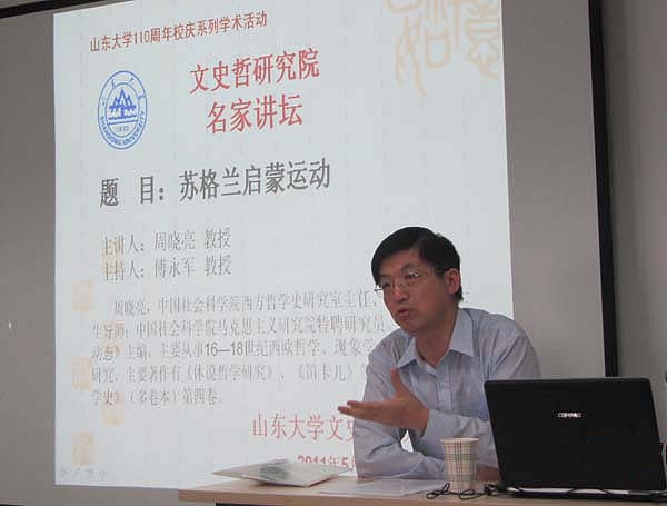 文史哲研究院主办的题为“苏格兰启蒙运动”的报告会在中心校区知新楼A座1422室顺利举行,主讲人为中国社会科学院周晓亮教授,傅永军院长主持此次报告会。