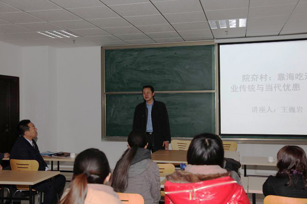 2011年3月14日下午,荣成市人和镇院夼村支部书记王巍岩先生,应邀在中心校区知新楼为我院师生民俗学博硕士举办“院夼村:靠海吃海的渔业传统与当代忧患”的讲座,校外多位民俗学者亦闻讯前来聆听。讲座由民俗学研究所所长张士闪教授主持,文史哲研究院院长傅永军为王巍岩先生颁发兼职研究员聘书,副院长李平生教授对讲座进行了学术总结。