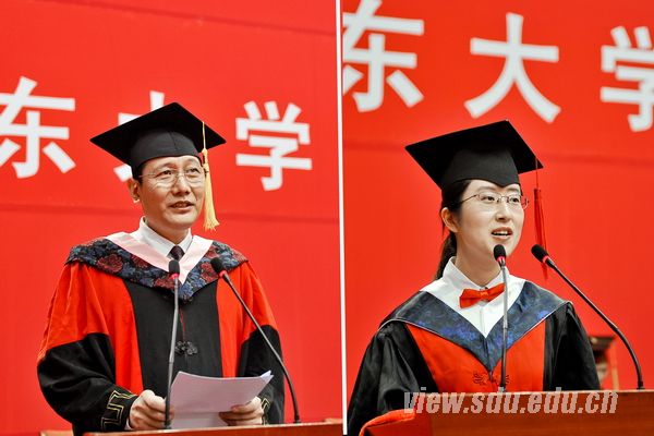 杜泽逊教授(左),毕业研究生代表、医学院2014届博士毕业生张宁(右)发言