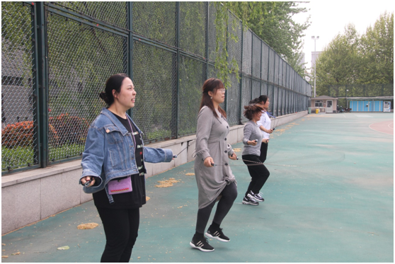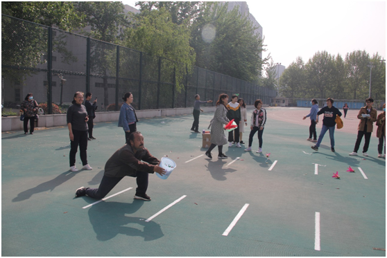 跳绳是相对轻松欢快的环节,女老师们英姿勃发,在项目中表现亮眼。“足球射门”“沙包投准”“套圈”和“飞镖投准”考察精准度和判断力,激烈程度有所降低,难度却丝毫未减。王承略老师一次精准的套圈命中,引得大家纷纷拍手叫好。“摸石头过河”则需要胆大心细,沉着稳定,比拼的是速度,更是心态——一旦从“石头”上掉下便前功尽弃。与第一个集体项目的激烈比拼不同,最后的集体项目“曲回运球”充满默契的配合:圆滚滚的网球在羽毛球拍上晃晃悠悠,球在传递,欢乐也感染了所有人。