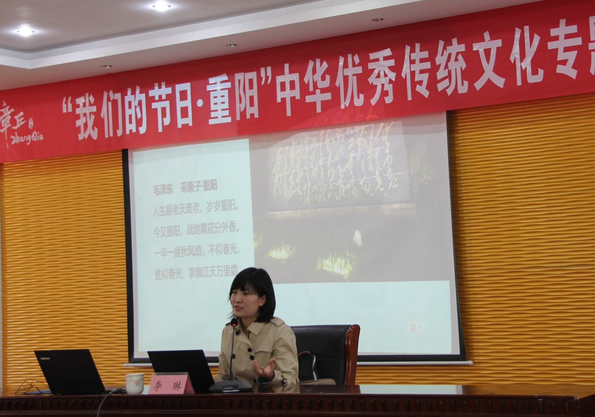 李琳以《重阳文化与中华美德》为题作了专题讲座。她首先以王维的名篇《九月九日忆山东兄弟》引入,略举几例涉及重阳节的古代诗词。她详细谈及重阳节的起源问题,展开叙述了重阳节日的传统习俗,从而联系起重阳文化背后敬老孝亲的美德内涵,以及对它的当代反思。李琳表示,每一个中国传统节日都蕴含着丰富的中华传统美德,而不仅仅是一种外在的表象和仪式,我们应当透过表象去领会其敬老孝亲的文化主题。重阳节作为我们中华优秀传统文化的代表,是展示和传播优秀文化民族文化的重要平台,是弘扬和培育伟大民族精神的重要载体,也是精神文化生活需求的重要的渠道。她指出,对传统节日的传承与重构也是一个传统文化新生的过程,所以我们应当保护传统节日的节俗功能、美德内涵和文化象征意义。