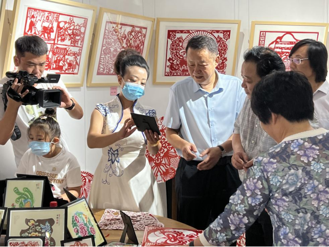 主旨演讲后,与会人员参观了“济阳@黄河”系列文化展。展览包括黄河文化摄影展、生态科普展、文化旅游展、济北手造产品陈列展。在一件件展览品与现场手工艺人的黑陶、剪纸、刻印、钩绣制作中,与会人员沉浸式体验到了济阳绵延悠久的历史底蕴。