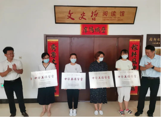 李宇兵、王展为建大花园社区、华夏山青社区、帝华鸿府社区、鲁商凤凰城社区颁授“中华美德学堂”牌匾。