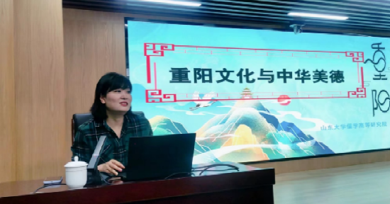 李琳以《重阳文化与中华美德》为题作了专题讲座。她以唐代诗人王维名篇《九月九日忆山东兄弟》作为切入点,列举几例涉及重阳节的古代诗词以说明自古以来重阳文化的普及程度。她详细叙述重阳节的起源问题,由此延伸阐述重阳节日的传统习俗,从而联系起重阳文化背后敬老孝亲的美德内涵,以及相关的的当代反思。李琳表示,每一个中国传统节日都蕴含着丰富的中华传统美德,而不仅仅是一种外在的表象和仪式,我们应当透过表象去领会其敬老孝亲的文化主题。重阳节作为我们中华优秀传统文化的代表,是展示和传播优秀文化民族文化的重要平台,是弘扬和培育伟大民族精神的重要载体,也是精神文化生活需求的重要的渠道。她指出,对传统节日的传承与重构也是一个传统文化新生的过程,所以我们应当保护传统节日的节俗功能、美德内涵和文化象征意义。