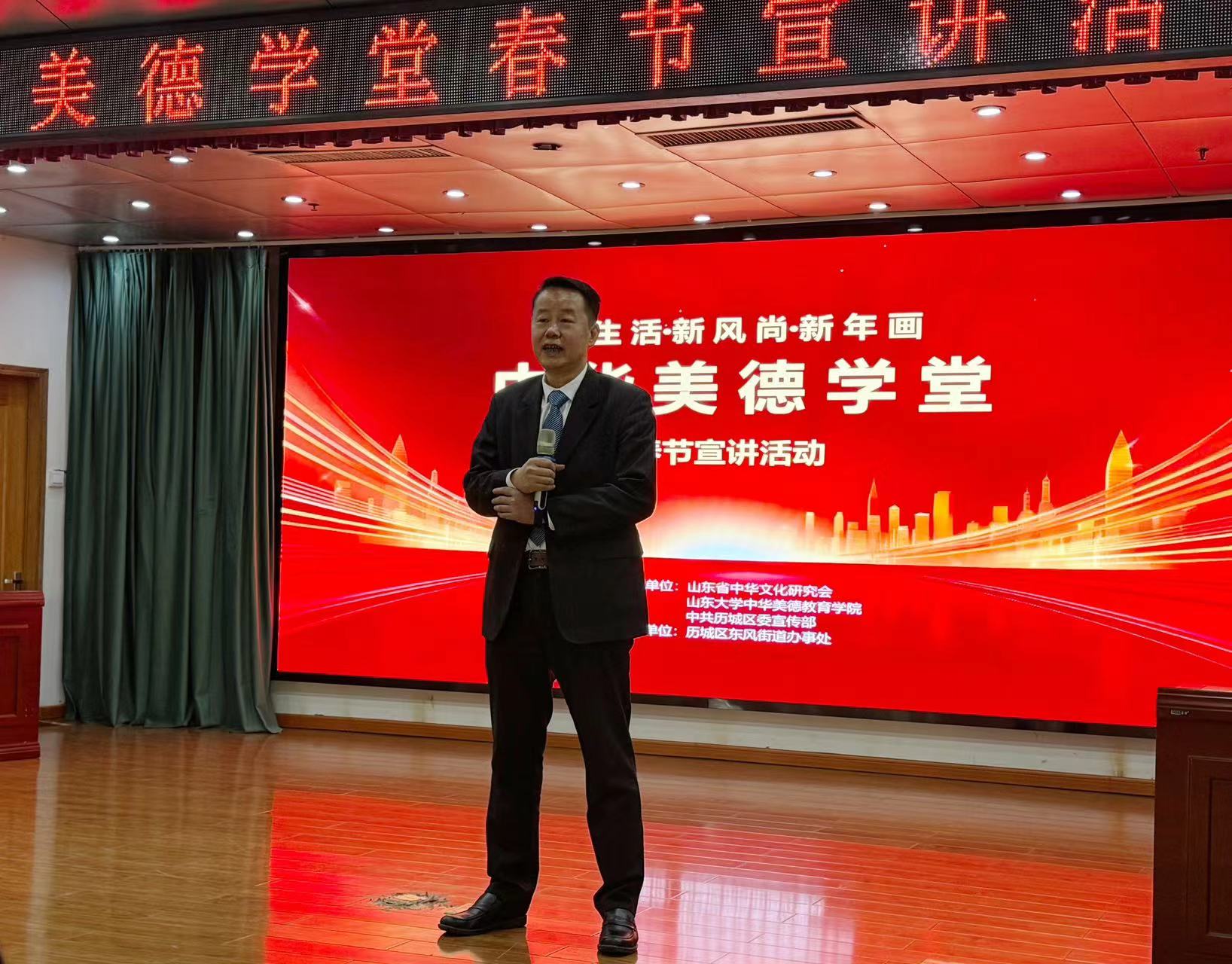 李宇兵在致辞中表示,中华优秀传统文化是中华文明的智慧结晶和精华所在,是中华民族的根和魂,是我们在世界文化激荡中站稳脚跟的根基。“美德历城”建设启动以来,我们已经共同举办8期“中华美德大讲堂”和多期“中华美德学堂”活动,已为审核合格的381家企事单位、村庄、社区颁授了“中华美德学堂”牌匾。东风街道秉持“传承优秀文化,促进东风发展”的初心不变,积极推进文化建设,在全市率先成立了文学艺术界联合会,创建历史文化展室,成立历城文化馆分馆、历城图书馆分馆、济南东风文化艺术交流中心等。今天在东风街道宣讲春节文化与中华美德,有助于我们感受中华美德的魅力,让“中华美德”之光照耀我们的心灵,让中华优秀传统文化之魂塑造我们的生活,为建设美德历城、美德济南、美德中国做出贡献。