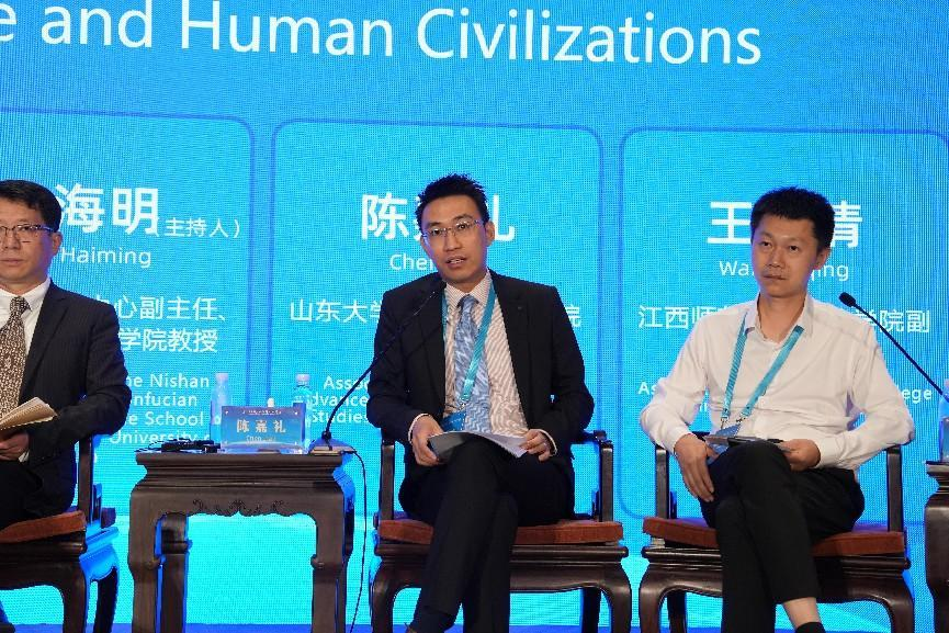 教授沈顺福、杨朝明,副教授陈嘉礼、李琳、曾美珠、邹晓东,副研究员蔡杰、李富强分别以“道、理与普遍性超越”,“泰山气象·天下观念·人类情怀——孔子‘登泰山而小天下’诠说”,“新时代的新方法:人工智能与中国古典学研究初探”,“中华‘天下观’的道德底色与政治远景”,“儒家‘礼乐文明’之重建——王船山的‘礼乐合论’思想”,“如何刻画进步的心灵——康德问题的阳明心学建模及优化”,“传统语境中的‘伦理’概念与中国文明特质”,“传统儒家伦理文明的再造与建设中华民族现代文明”为题。儒家文明省部共建协同创新中心邓红教授、政治学与公共管理学院孔令栋教授、马克思主义学院周向军教授、哲学与社会发展学院王新春教授、文学院古代文学研究所刘占召副教授分别以“董仲舒王充性论比较”,“儒学文化与当代国际秩序的重构”,“关于建设中华民族现代文明的几点思考”,“传统的赓续与现代文明的构建——从魏相着眼王道之治的卦气易学说开去”,“简易之风与中唐儒学的新变”为题,集中探讨了中华优秀传统文化与现代文明的结合点,凸显了中华文明特性对现代文明的贡献,为推动人类命运共同体的构建贡献了学术力量。
