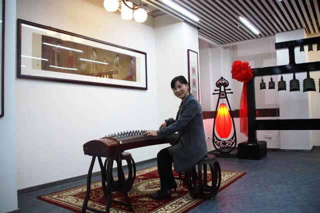 感受中国传统文化元素:瓷器、围棋、编钟、古筝、茶艺、民间泥塑。