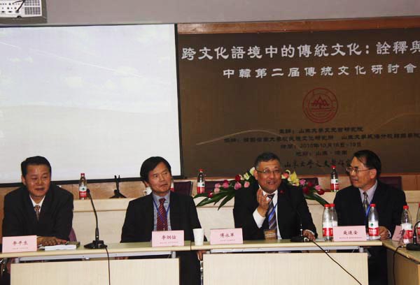 在大会讨论过程中,二十二位学者分别提交了自己在传统文化领域的最新研究成果。学者们从不同的国别和视角探讨了蚩尤文化、孔教运动、中国哲学终极关怀、《管子》牧民思想、荀子性恶说、理气为一、《热河日记》的笔谈内容、扬雄《方言》、多义词的韩中对照、中国汉字的影响、儒家现代命运等一系列问题,为研究东亚文化注入了新鲜的学术思想,开阔了彼此的视野。我院张富祥教授作了题为《东夷文化序数——基于海岱区域古文化的考察》的发言,刘宗迪教授作了题为《古代朝鮮的天下观与的影响》的发言,杨华讲师作了题为《美国学者列文森关于儒家現代命运的思考》的发言,均受到与会学者的关注,引起了热烈的讨论。与会学者认为,本次会议所讨论的问题,为研究东亚文化注入了新鲜的学术思想,开阔了彼此的视野。