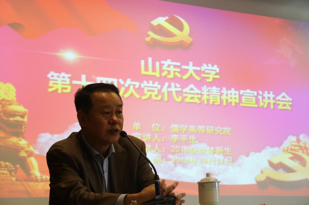 在校史校情教育的背景之下,李平生书记结合学校第十四次党代会纲要及全国教育大会的要求,切入本次党代会精神宣讲会的内容,详细宣讲了学校第十四次党代会举行的时代背景及重要意义,正确地认识并客观地分析了第十三次党代会召开以来学校取得的成就及存在的问题,带领师生深刻认识、把握了学校第十四次党代会的精神实质。特别对新时代山大发展的历史方位、奋斗目标和学校发展的三个阶段、未来发展的“六大战略”、五年间的“十大任务”、学校党建工作作了详细宣讲。李平生指出,我们要高举习近平新时代中国特色社会主义思想的伟大旗帜,深入贯彻落实中央高校思想政治工作精神和中央31号文件精神,不忘初心,坚持“为天下储人才,为国家图富强”的办学宗旨,坚持为国育贤,扎根齐鲁大地,服务社会、服务山东、服务国家,争创具有“中国特色、山大风格”的世界一流大学。