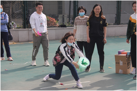 第一个项目“踩气球”将整个运动场上的氛围瞬间点燃。在激烈的争夺中,老师们既要瞄准对手的气球,又要保护自己的气球,场面好不热闹。“明枪易躲,暗箭难防”,随着圈子的不断缩小,“幸存”的人数也不断减少。热烈的“争斗”后,李琳老师笑到最后,获得一等奖。