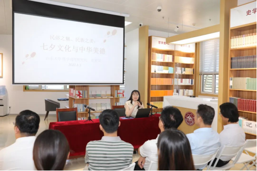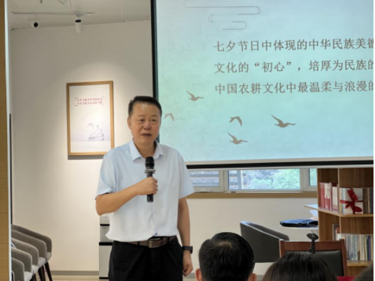任雅萱从七夕节日的起源和演变、七夕文化核心主题的阐述、研究传承和创新传统节日的重要性三个方面为大家作了一场精彩的主题讲座。任雅萱表示,七夕文化以历史人物牛郎和织女为核心,在他们身上包含了中国传统的人伦道德、祭拜祈福里“天人合一”的宇宙观、爱情悲剧中“和而不同”的社会观、民俗活动中“人心和善”的道德观,以及忠贞与坚守的朴素爱情观。中华优秀传统文化博大精深、内涵丰富,美德文化是其中一个重要组成部分,要深入开展“我们的节日”主题活动,实施中国传统节日振兴工程。任雅萱提出要丰富七夕传统节日文化内涵,形成新的节日习俗:第一,复兴传统乞巧内涵、重视手工实践;第二,阐释牛郎织女传说,强调爱情忠贞;第三,传承七夕成年礼俗,增强社会团结和谐,活跃与丰富地方民俗生活;第四,充分挖掘七夕节的诗词资源,弘扬中华优秀传统文化。大众对于传统节日所具有的仪式感和文化内涵的认可,是传统节日的魅力所在,是对中华美德的认同。要积极营造尊重民族传统节日,将传统节日的研究和保护有机地结合在一起,使传统节日不断得以传承和发展。
