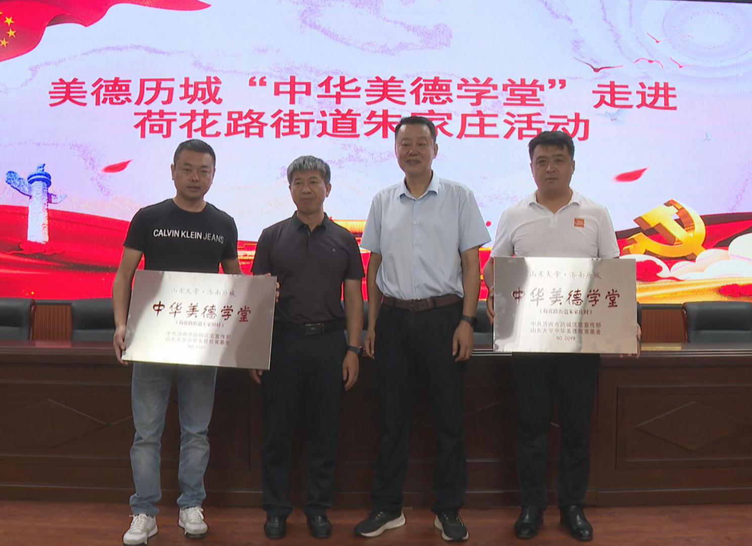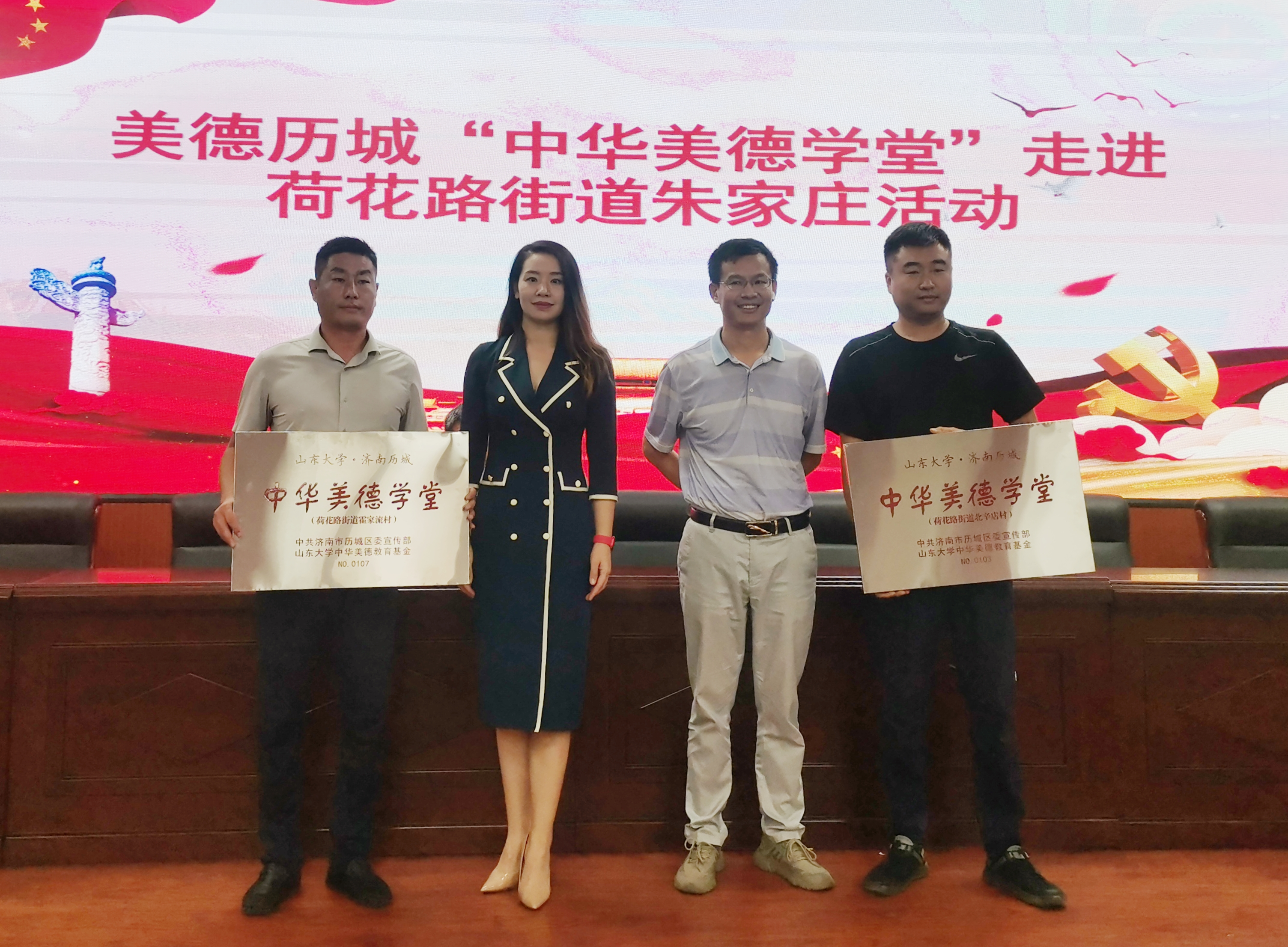 宣讲活动开始之前,举行了历城区荷花路街道部分乡村社区“中华美德学堂”牌匾颁授仪式。李平生、张晓分别为朱家庄村、王家闸村颁授了“中华美德学堂”牌匾;马本法、王珊珊为北辛店村、霍家流村颁授了“中华美德学堂”牌匾。