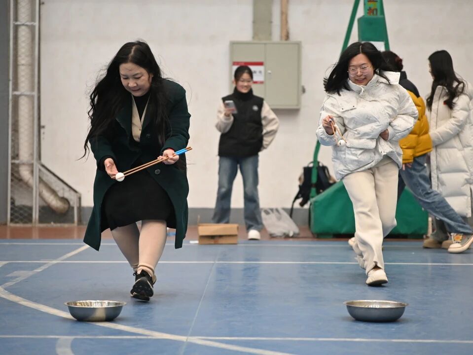 在接下来的项目中,各位老师全情投入,展现出课堂之外的别样风采。在热门项目“足球射门”中,老师们凝神屏息、精准施射,每一次起脚都牵动人心。刘丽丽老师凭借出色的命中率,以进球总数最高荣获该项目第一名。“夹乒乓球”项目同样妙趣横生,老师们手持长筷夹起的乒乓球,在五米赛道间稳健疾行,于准度与速度中寻求平衡。察应坤老师动作敏捷,以显著优势拔得头筹。双人项目中,“背对背行走”格外考验默契。老师们两两组合,背靠背夹着气球,侧身挪步,既要防止气球掉落或挤破,又要协调步伐向前冲刺。最终,代亮老师与陈嘉礼老师组合凭借完美配合脱颖而出,摘得该项目冠军。此外,“跳绳”“投沙包”“飞镖”等项目同样看点十足,老师们各展所长,在比拼中赛出了活力,也赛出了情谊。